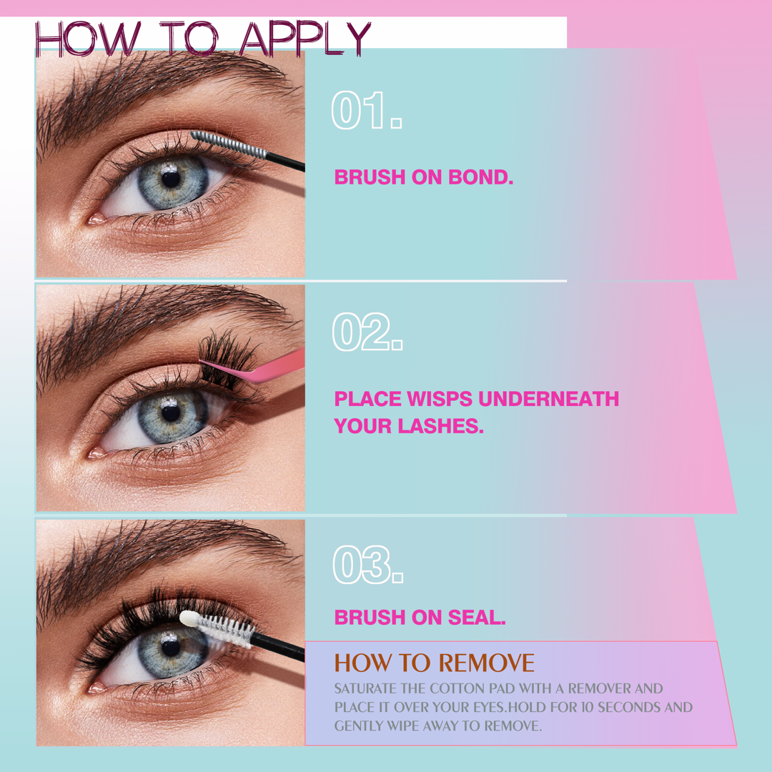 1-Super easy to apply; 2-No adhesive needed; 3-Blends seamlessly with your lash line;4-Vegan & Cruelty Free;5-Mess free;6-Lasts up to 5 days; 7-Perfect for on the go.